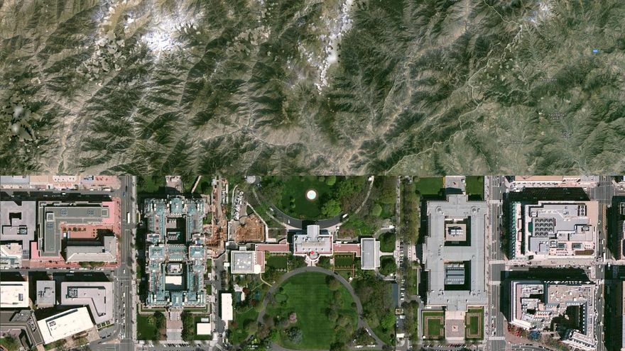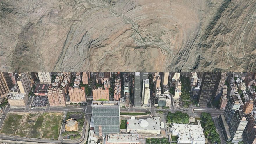 Precisamente este tipo de imágenes, las que toman esos ingenios en órbita, han inspirado su serie de postales compuestas por collages en los que pone en relación dos tipos de fotografías. Una muestra parcialmente un lugar donde ocurrió un ataque de un dron. Está tomada como si estuviera hecha a través de un satélite. La otra fotografía del collage deja ver espacios seguros en Occidente.