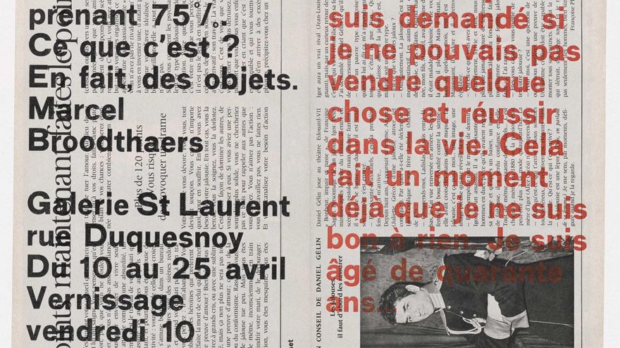 Por otra parte, los mejillones son entidades autosuficientes aunque al mismo tiempo uno de los símbolos menores de Bélgica. Y esto ya no es simbólico, sino metafórico o alegórico. Como fuere, Broodthaers realiza con ambos elementos y con muchos más lo que desde todos los puntos de vista son mercancías vendibles. Raras, como una tibia pintada con los colores de la bandera belga, pero vendibles. Él lo venía a decir solo medio en broma en el panfleto que escribió para su primera exposición: trataba de hacer algo que le sacara de apuros.
