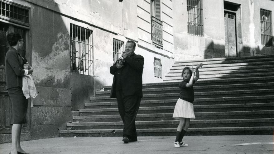 La relación del director de Ciudadano Kane con Madrid es de sobra conocida y, de hecho, fue en un hotel de la capital donde dio a luz a su última y maldita película. En la fotografía escogida por García, de 1960, “Welles está en la Travesía de Nuncio junto Paola Mori, su mujer en ese momento, y su hija Elizabeth Welles. Aparece sonriendo con una cámara y con su puro, relajado y feliz de estar con su familia”.