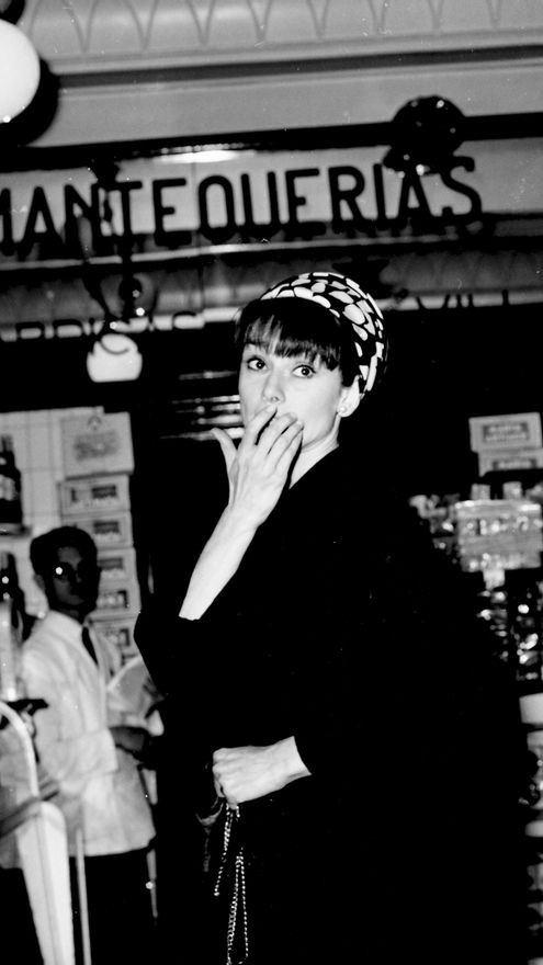 Mientras Audrey Hepburn estuvo casada con el actor Mel Ferrer, ambos pasaban largas temporadas en Madrid durante los rodajes de él, como La caída del Imperio romano de Anthony Mann. En el caso de la instantánea, “el fotógrafo Gianni Ferrari se la encontró por la calle y le preguntó si podía caminar con ella un rato. Durante 20 minutos la siguió mientras compraba fruta en Mantequerías Leonesas y hablaba con los tenderos. Unos años antes había rodado Desayuno en Tiffanys, y aquí aparece tan castiza que es un contraste precioso”, dice García.