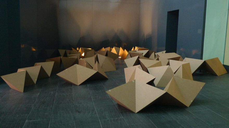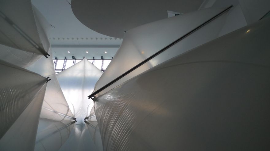 Un factor que se descubre pronto y se suma a la experiencia es el hecho de que los tetraedros solo se sostienen al estar hinchados por un ventilador, un poco como las naves o cúpulas neumáticas que se vieron bastante en los 70, de forma muy notable las diseñadas por José Miguel de Prada para los ya musealizados Encuentros de Pamplona de 1972. Es decir, la escultura, que desde los asirios hasta Richard Serra ha tenido una vocación de permanencia como pocas artes, se revela a sí misma como efímera y sujeta a imponderables muy imaginables (en Pamplona una cúpula se vino abajo). Si se detiene el flujo de aire aquello colapsa, lo que no deja de ser una parábola sobre la ciudad, la arquitectura y la vida. Por cierto, se puede ver desde una balaustrada superior, otro punto de vista, muy normal en cualquier centro comercial, algo ignorado en general por el arte.