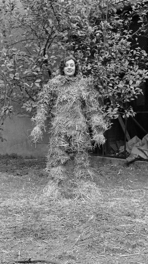 Otra de sus artistas expuestas es Fina Miralles con Relaciones. Relación entre el cuerpo y los elementos naturales. El cuerpo cubierto de paja, de 1975. En esta serie de fotografías, una mujer aparece vestida en con unos pantalones y un jersey en un jardín, para terminar mimetizándose con éste, cubierta de ramas y de hierba. Para Saura, “explora la aparición y desaparición del sujeto en el espacio público”, y cómo la mujer acaba invisibilizada muchas veces en éste.
