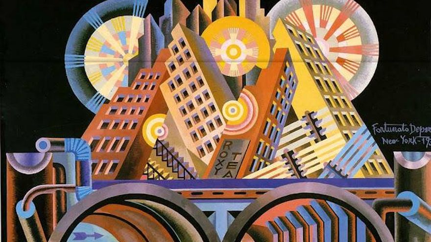 Podría pensarse que este tipo de ilustración sorprendería muchísimo en los Estados Unidos. No tanto. Justo en 1930 el Art Deco era el estilo dominante en el diseño y la arquitectura de las grandes ciudades americanas y el futurismo ya maduro de Depero venía a ser una vuelta de tuerca en un ambiente muy favorable a la figuración geométrica. Lo cual no impide que sean estupendas.