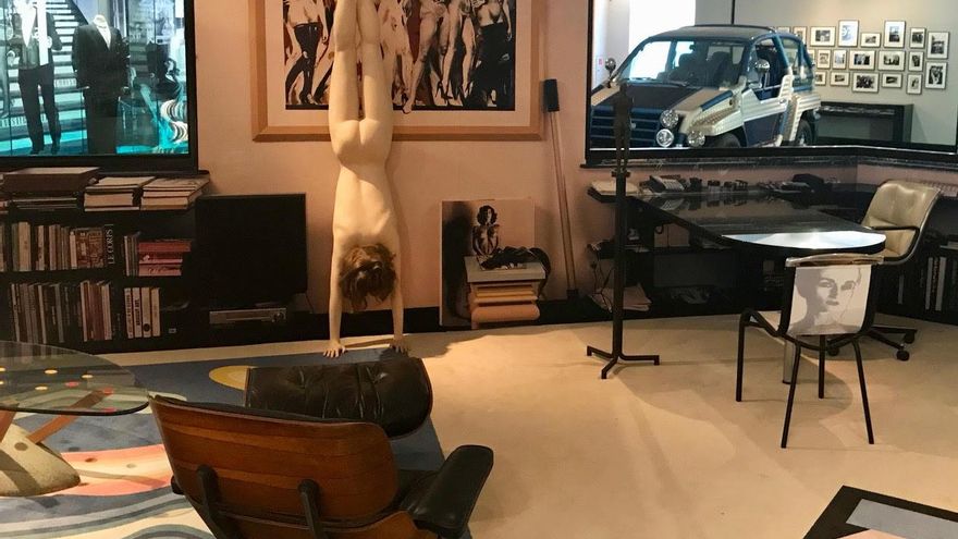 En la Fundación Helmut Newton se puede ver hasta una reproducción de cómo era la oficina en la que trabajaba el artista en Mónaco. En la habitación hay una estatua de una mujer haciendo el pino. Muy de acuerdo con cómo Newton solía fotografiar a las mujeres, esa representación femenina lleva únicamente unos zapatos de tacón plateados.