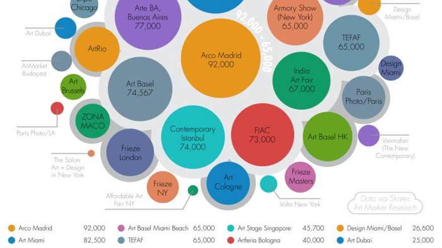 Sabemos o intuimos que el 35% de las ventas en España tienen lugar en ferias, nacionales o internacionales. Eso es al menos lo que decía la Fundación Arte y Mecenazgo en su informe sobre el Mercado español del arte 2014. Según el informe, el 72% de las 650 galerías españolas de alguna importancia (hay casi 3.000 registradas) vendió arte contemporáneo y el 99% de las ventas no superó los 50.000 euros por unidad. Pero todo esto es sigue en penumbra: un estudio serio como pretende ser el de la FAM no puede decir: “Se calcula que, en 2013, ARCO generó para la economía española unos ingresos de más de 100 millones de euros en menos de una semana”. ¿Cómo que “se calcula”? Un balance es un balance y se basa en datos, no en cálculos que tampoco se explican.