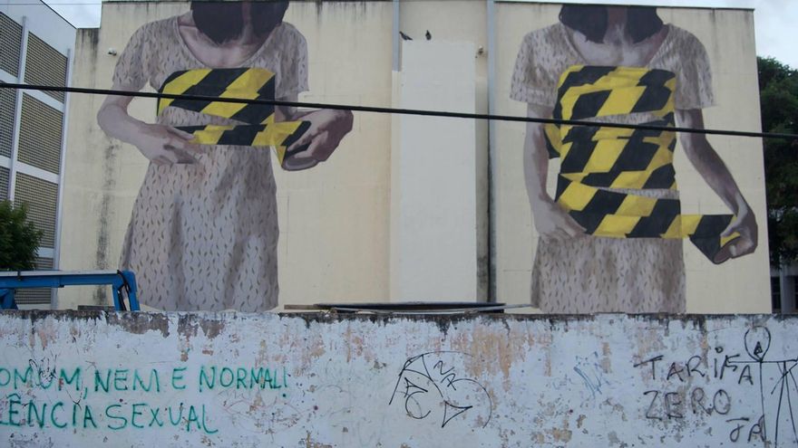 Su último trabajo en Madrid puede verse en Vallecas, donde una figura femenina con las manos a la espalda custodia un antiguo bloque de pisos. “Este muro -describe la artista- habla del permanente estado de negación/aceptación sobre quien somos y lo que queremos”. Se titula Contradicción.