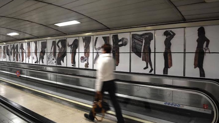 La primera obra a su nombre, 24 fragmentos de una jornada laboral, da vida a los pasillos impersonales del metro de la capital con dibujos en papel que visibilizan la sobrecarga de trabajo de muchas mujeres.