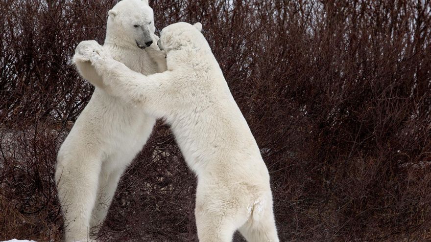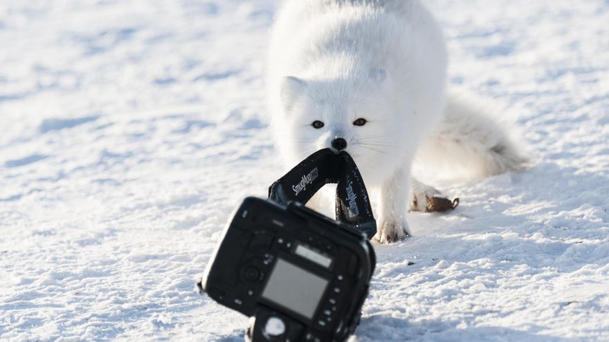En las siguientes, un oso polar mira a cámara mientras yace tumbado, convirtiendo la nieve en su sofá particular. También vemos a un conejo que se tapa con sus patas la cara evitando ser fotografiado o tratando de disimular la vergüenza. Menos tierna es la bronca entre dos ardillas con “grito” incluido de la mayor a la pequeña. Asimismo, aparece un zorro polar que, probablemente, harto de la sesión fotográfica, ha optado por robar la cámara a su operador. Y una segunda ardilla, una que ha decidido convertir un tallo en su nueva diadema.