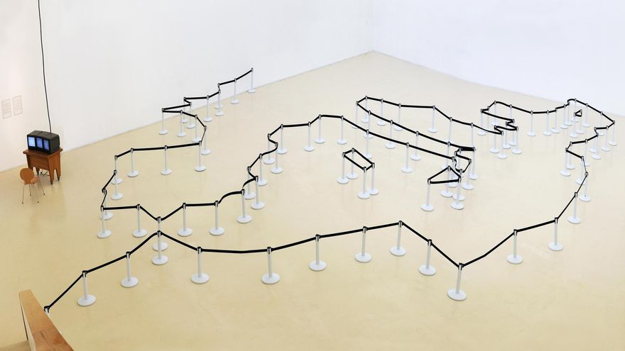 La exposición en sí se compone de pocos elementos: esculturas y postes separadores con cinta retráctil. Fijémonos en los segundos. Estos separadores son como los de las salidas de los aeropuertos, de esos que se disponen como una especie de laberinto que hay que seguir en toda su longitud incluso aunque uno esté solo. Siendo lo paradójico del asunto que esos postes están diseñados precisamente para poder adaptarse a diferentes situaciones. El 100% de las veces quien se adapta es el viajero, obligado a recorrer 100 metros en idas y vueltas cuando podrían haber sido solo 10 metros en línea recta. El orden como imposición, fastidio e inutilidad.