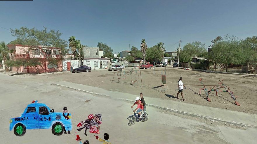 Kalesnik nació en Ciudad de México en 1986, urbe en la que creció hasta mudarse a Madrid para estudiar en la EFTI, prestigiosa escuela de fotografía. Sin olvidar el país que le vio nacer, y el drama de la violencia que azota muchas de sus ciudades, presenta en PHotoEspaña El lugar donde vivo. Un proyecto de investigación que mezcla capturas de Google Street View de las metrópolis con mayor índice de violencia del país, con dibujos infantiles de niños mexicanos a los que se les dijo “Dibuja el lugar donde vives”. El resultado no deja indiferente.