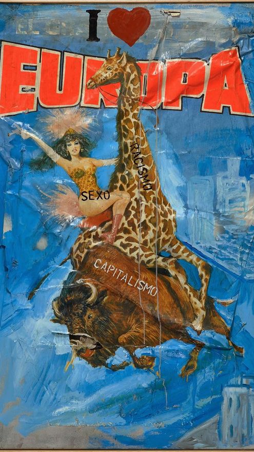 Pero acabemos en subida. La serie Circo, de principios de los 90 y que origina el título de esta exposición Atomic Circus, surgió de un viaje a San Sebastián donde Gadea tuvo la idea de arrancar de las tapias posters de circo. Este material sirvió después como fondo a veces, otras como motivo. Y es una serie fantástica en la que se concentran casi todos los temas que Gadea había tratado antes o trataría después. Sobre todo, hay que decirlo, la política a nivel local y mundial, de forma muy irónica y poco panfletaria. Además, son sus obras más complejas en lo formal y de tal potencia que motivos como el del Payaso la acompañarían ya toda su vida. La vida de una mujer-fuerza que al final sucumbió a sus propios fantasmas pero habiendo dejado mucho detrás. Esta exposición, por ejemplo.