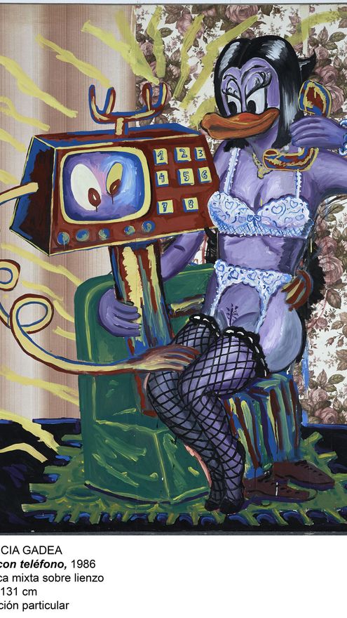 Este era el contexto y en él, Patricia Gadea se movió desde el principio como una fuerza de la naturaleza. Sus primeros cuadros ya podrían llamarse pop, pero un pop muy alejado del pop limpio y canónico de Warhol o Lichtenstein. En esos cuadros de 1985 aparece, si no una voluntad absolutamente expresionista, tampoco el deseo de una “línea clara” en pintura. En estos comienzos de su carrera, Francisco Calvo-Serraller escribía: “La artista hace collages incluso cuando no utiliza literalmente el procedimiento. Porque donde en realidad lleva las tijeras es en los ojos”. Tenía razón, sin duda, y prácticamente toda la obra posterior de Gadea es la confirmación.