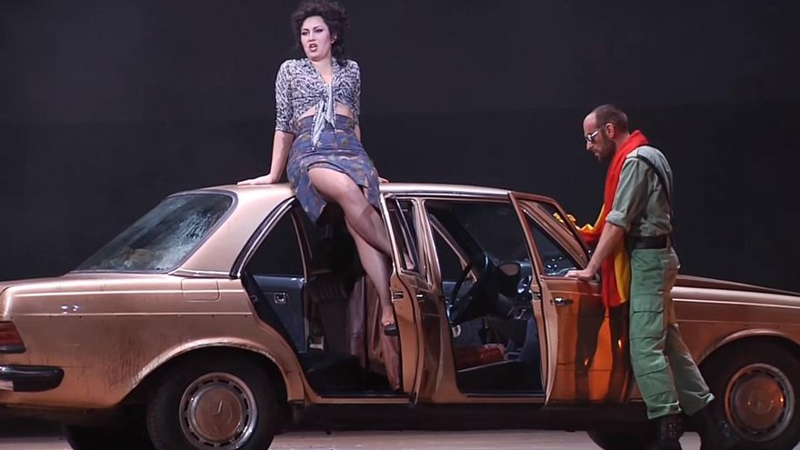 En la versión de Bieito de una de las óperas más representadas de la historia se narra la historia de la cigarrera Carmen con el soldado don José. La acción está ambientada en la Andalucía de los años 70 y cambia los soldados por legionarios. El stage donde se desarrolla la obra contiene un gran mástil con la bandera española, en la que también aparece un toro de Osborne y una cabina telefónica.