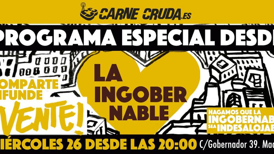 El nuevo alcalde del PP en el Ayuntamiento de Madrid, José Luis Martínez-Almeida, reveló durante la campaña su intención de desmantelar el centro social ocupado de La Ingobernable. Ante las amenazas directas hacia este emblema madrileño, Carne Cruda celebrará un programa especial contra su desalojo el próximo miércoles 26 de junio a partir de las 20h.