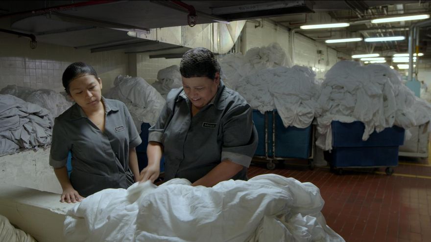 Al tiempo que se muestra firme en la utilización de códigos audiovisuales del cine carcelario. El conjunto de elementos que llenan cada plano, desde los uniformes a las grises a la configuración de las estancias del servicio —como la lavandería o el comedor—, dan buena cuenta de lo opresivo de la situación laboral de Evelina. Una situación a la que solo existe una salida. Decidir tomarla o no es la duda última de La camarista.