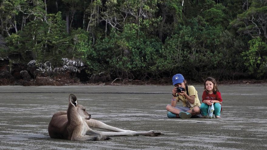 El encuentro del pequeño con su soñado animal ocurrió en la ladera de una montaña de la Patagonia. Después fueron los bisontes norteamericanos en el parque de Yellowstone y el cocodrilo marino en Australia, mientras los cuatro navegaban sobre una pequeña lancha entre manglares. Los ojos de los niños al enfrentarse ante el gigante reptil, o la tranquilidad con la que reposan junto a un canguro, representa la viva simbiosis entre la fauna y el ser humano.