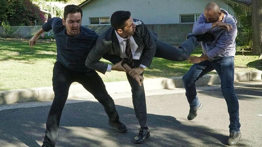 El esquema se repite así hasta la extenuación. La de los personajes, se entiende. Desarmado de su arsenal de movimientos insignia, Adkins se convierte en un pelele zarandeado por enormes secuaces contra paredes y mobiliario, mientras su compañero de travesuras transpira y exhala como un gorrino antes de recibir el estoque final.