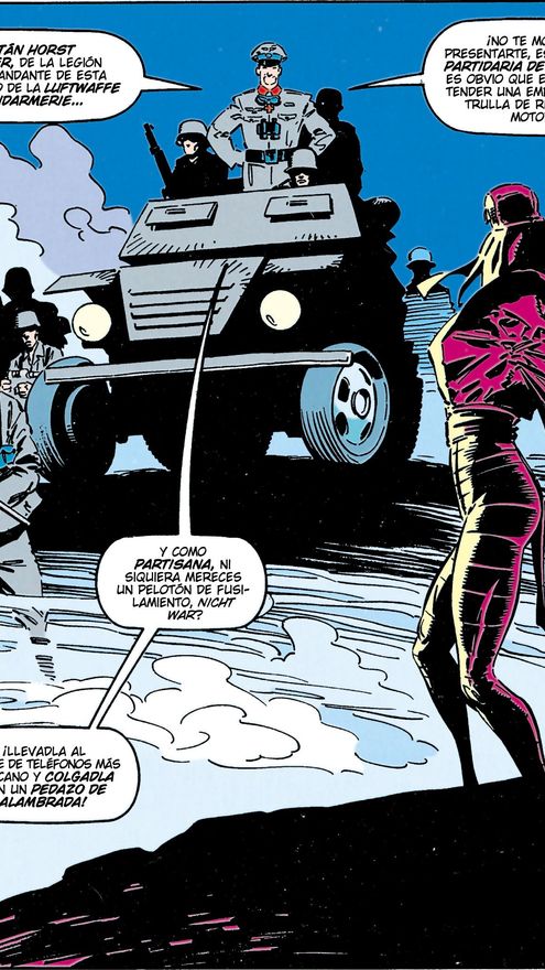 No obstante, aquel retrato de España no dura mucho más de dos páginas. Inmediatamente, el espectáculo taurino es interrumpido por un bombardero Stuka de la Legión Cóndor. “¡Nazis luchando por los rebeldes!”, grita el gentío de la plaza. “Está volando lo bastante bajo como para ver que hay mujeres y niños. Para él no es una batalla. ¡Es pura maldad!”, reflexiona Lobezno, quien, como cabría esperar, recurre a una solución que dista mucho de ser sutil: decide coger el estoque del torero, “ese pincho”, y clavarlo en el aeroplano para hacerlo estallar por los aires.