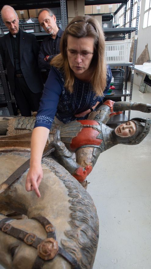La Dirección General de Cultura del Gobierno de Navarra ha terminado la restauración de la escultura de San Jorge, que ha sido llamada el eccehomo de Estella, ya que en 2018 esta talla del siglo XVI fue objeto de un desafortunado “repintado” por parte de un taller de manualidades de la localidad.