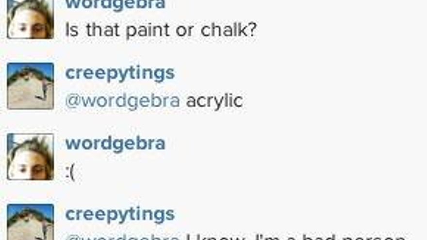 Creepytings -como firmaba la chica- tiene prohibida la entrada al 20% de los EEUU. Es la extensión de terreno que ocupa la red de parques nacionales estadounidenses. Después de pintar, firmaba y subía las fotos a Tumblr e Instagram, ambas redes con el mismo nombre que su rúbrica. Primer error. Un día, cuando un usuario le preguntó si utilizaba tizas o pintura para realizar los dibujos, Nocket respondió, sincera: “Acrílica. Lo sé, soy una mala persona”. Segundo error. La artista siguió subiendo más fotos después de aquello, con sus perfiles abiertos al público. Y ahí cometió el tercer error.