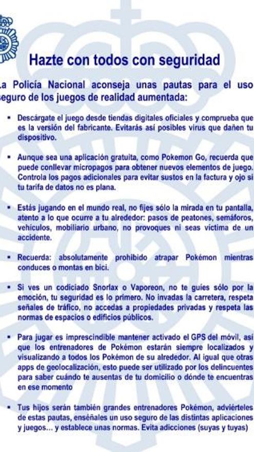 “Si ves un codiciado Snorlax o Vaporeon, no te guíes solo por la emoción, tu seguridad es lo primero”, indican en uno de los siete puntos que conforman su manual del buen jugador. Para no verse en la tesitura de la Policía de Estados Unidos -que han multado en varias ocasiones a Pokemásters al volante-, sus equivalentes nacionales también recuerdan que está terminantemente prohibido cazar mientras conducimos o montamos en bici.