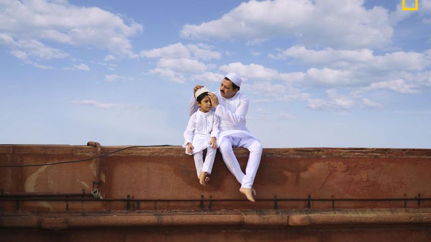 “Un padre y un hijo con vestimenta blanca tradicional sentados en una mezquita en Nueva Delhi, la India, bajo un cielo azul el día del Eid al-Fitr, cuando se celebra la conclusión del mes sagrado islámico de Ramadán. Esta foto muestra el hermoso vínculo entre dos generaciones”.