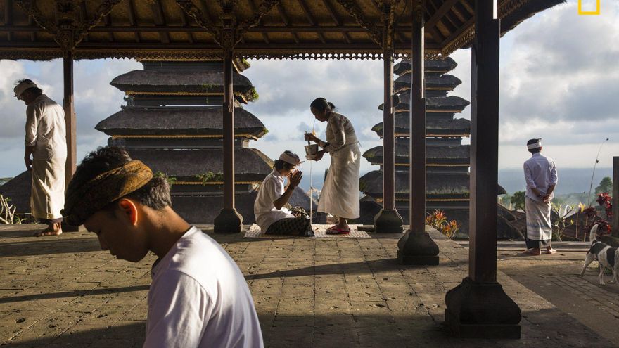 “En la hermosa isla de Bali, el Templo de Besakih ha sido conocido por los lugareños como el ”Templo de la Madre“ durante más de mil años. Ubicado en lo alto de las laderas del monte Agung, un volcán sagrado, Besakih consta de tres templos principales dedicados a la trinidad hindú: Shiva, Brahma y Vishnu. Aquí, los hindúes balineses suelen venir a orar, hacer ofrendas y tomar las bendiciones de los pemangku (sacerdotes)”.