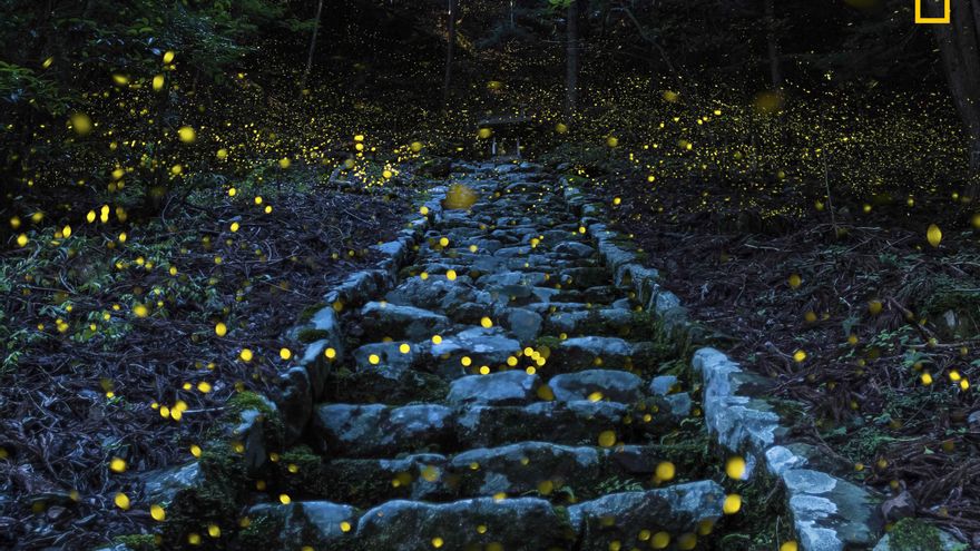 “En una aldea remota de la región de Tamba, Japón, luciérnagas centelleantes iluminan el Bosque de los Dioses en una noche de verano. Las luciérnagas alfombran la escalera que conduce a un pequeño santuario venerado por la gente del lugar, creando una atmósfera mágica”.