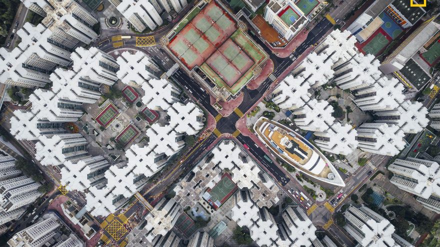 “Vista aérea del jardín de Whampoa, Hong Kong, que revela el denso encaje de sus edificios. Me inspiré en la ciudad amurallada de Kowloon -el lugar con más densidad de población de la Tierra- que fue demolida hace casi tres décadas. Cientos de casas estaban apiladas unas encima de otras y había muy poco espacio. La ciudad amurallada de Kowloon puede haber desaparecido, pero su legado permanece”.