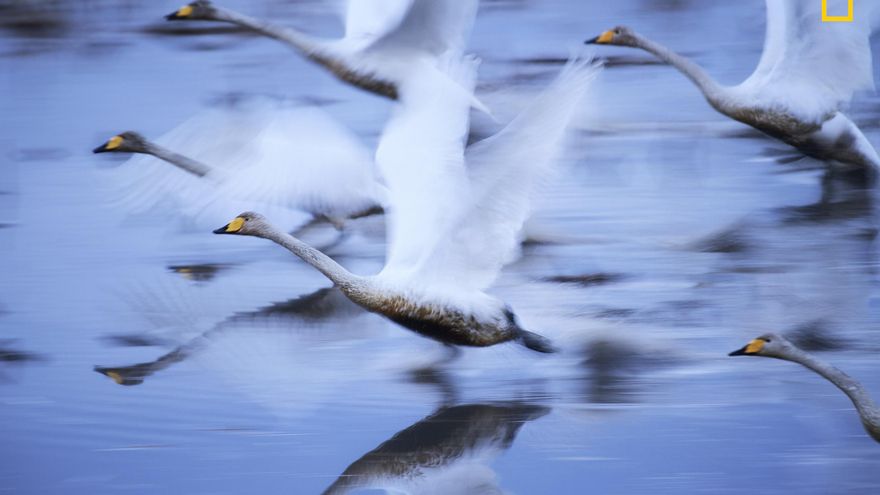 “Los cisnes se deslizan sobre el agua en Kabukurinuma, Osaki, Japón, un humedal protegido. Puesto que muchos de los humedales de Japón se han perdido, esta área se ha convertido en un raro lugar de hibernación para las aves y puede ser un último paraíso para ellos. Yo estaba particularmente impresionado por los cisnes, y tuve mucho cuidado de no molestarlos cuando tomé las fotos. Tuve en cuenta la dirección del viento y la velocidad de obturación para capturar la fuerza y la elegancia de su aleteo”.