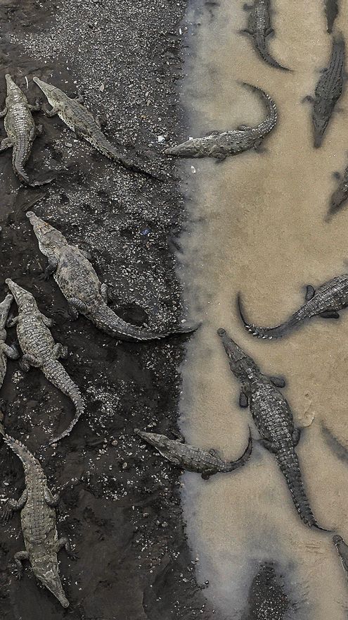 “Esta imagen fue tomada en Costa Rica, cuando viajaba de Monteverde a Playa Hermosa. Al cruzar este río, puedes pararte y asomarte al borde del puente. Abajo, viven más de 35 cocodrilos gigantes, que se relajan en las orillas fangosas del río. Quería capturar el fuerte contraste entre los cocodrilos de tierra y agua. En las aguas turbias, los contornos del cuerpo de estas bestias permanecen ocultas, y solo se puede ver su verdadera dimensión cuando emergen en el río”.
