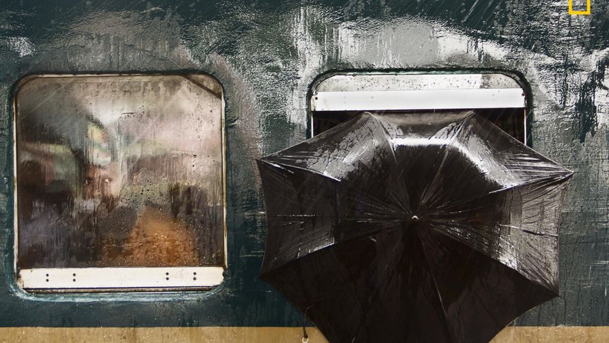 “Un tren que viene de Dhaka hace una pausa en la estación de ferrocarril de Tongi en Gazipur, Bangladesh, una mañana lluviosa. De repente vi un par de ojos curiosos mirándome a través de la brumosa ventana, y a su lado un paraguas negro protegía a los pasajeros de la lluvia. Juntos, crearon un momento de ensueño”.