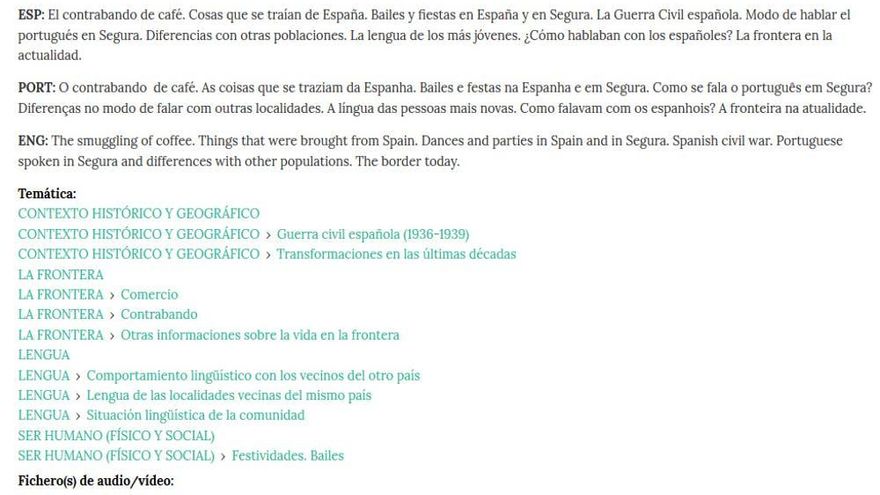 Se dialogaba alrededor de tres ejes temáticos. El primero, los nombres usados por los informantes para plantas, animales, utensilios de la vida cotidiana, etc. El segundo, sus percepciones lingüísticas: ¿es igual la lengua de los jóvenes y de los mayores? ¿en qué pueblos hablan distinto? ¿se entienden bien con la gente del otro lado de la Raya?… En tercer lugar, se conversaba sobre la vida en la Raya: historias del contrabando, ocasiones de convivencia entre españoles y portugueses, etc.