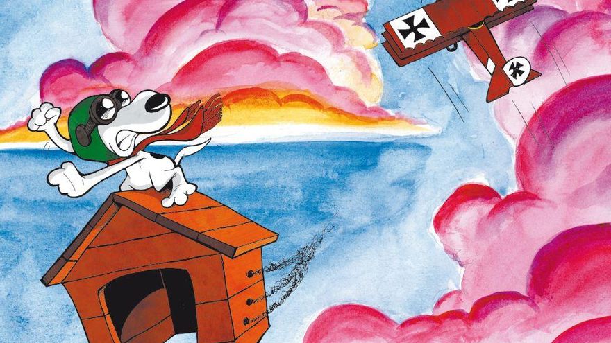 Lucas Turnbloom rememora su descubrimiento de Peanuts gracias a unos libritos que le compró su madre en los ochenta. “Hoy sólo sobrevive uno de esos libros. Cada vez que lo veo me trae la felicidad. Para mí la felicidad es el libro de un cachorro… desgastado”, señala. Su viñeta, coloreada, muestra a ese Snoopy miembro de la aviación enfrentándose al Barón Rojo.