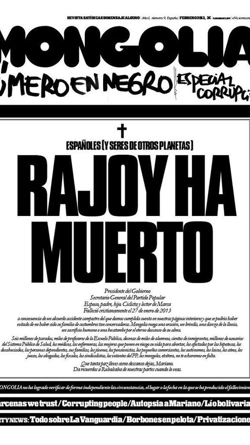 La portada con el fallecimiento de Rajoy fue muy celebrada en ambientes de ultraizquierda moderada porque vivían en el mismo engaño que nosotros. Incluso organizamos velatorios y colgamos versiones reducidas por los portales para anunciar el deceso. Lo que no sabíamos es que el Presidente seguía vivito y se reía de nosotros con un buen puro en la boca y un aliento que no lo querría Javier Cárdenas para si“.