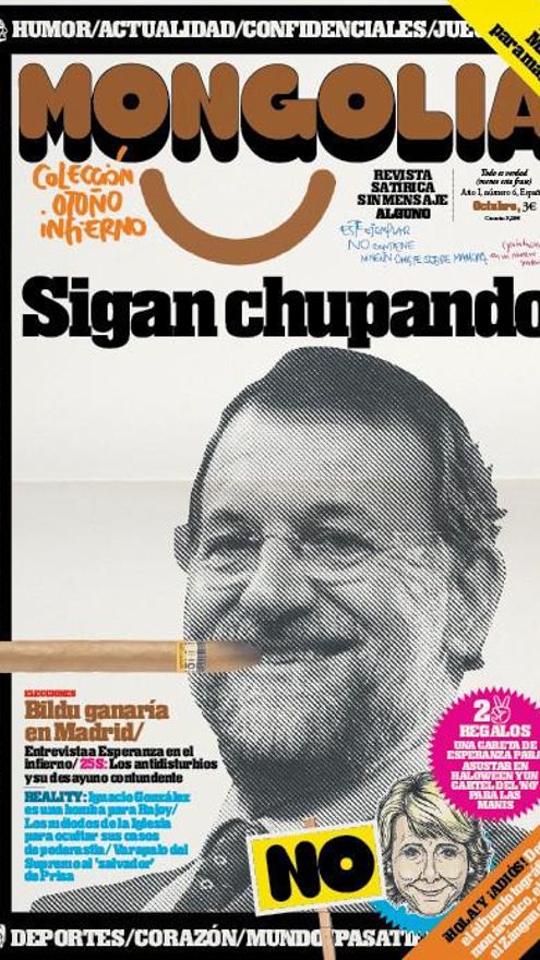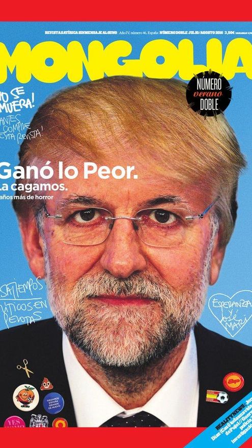 Ahora, Mongolia ha reunido sus 101 peores portadas en un libro puesto en marcha gracias al crowdfunding. Un gran número de ellas tienen a políticos españoles como protagonistas y a la corrupción como telón de fondo. Pero sin duda, Mariano Rajoy ha sido uno de los grandes artistas invitados de la publicación desde su nacimiento. Estas son algunas de las mejores/peores portadas dedicadas al presidente del Gobierno explicadas por sus creadores.