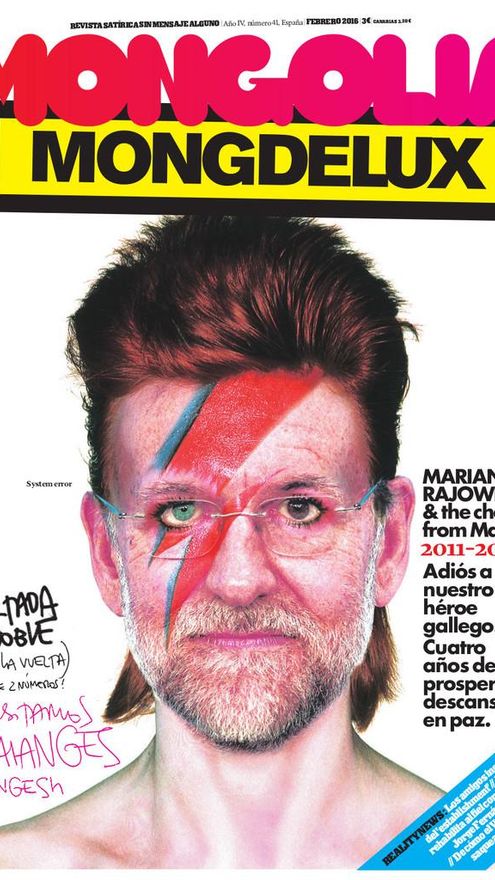 “Lección 7.290 de Mongolia: ”Sobre el asco de juntar elementos antitéticos“. A poca gente admiramos más que a David Bowie. A poca gente despreciamos más que a Mariano Rajoy. Juntando esos dos términos, un mecanismo habitual en la sátira, nos queda un precioso engendro que despertará el asco más grande junto con la simpatía más grande. Y si ya le pones una cabecera copia de Rockdelux, el pastel queda perfecto.”