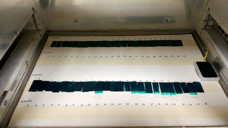 Para crear este modelo, se tomaron medidas espectrales FTIR de estas probetas con edades variadas, obteniendo un espectro para cada cada momento de la degradación de la pintura acrílica. Algo parecido a un time lapse pero con fotos químicas. Para ello, las muestras se introdujeron en una cámara de envejecimiento acelerado bajo condiciones controladas de luz, temperatura y humedad, logrando en pocos meses un envejecimiento equiparable a varios años de envejecimiento natural.