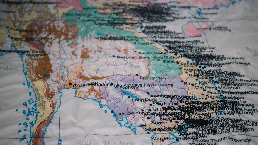 Por otro lado, la misma base de datos no está cerrada. Cada día se producen nuevos bombardeos sobre la población y algunos antiguos, en zonas como Indochina, aun no han sido bien documentados. De forma simbólica y práctica, esta actualización seguirá realizándose mientras dure la exposición con en trabajo presencial de alumnos de la facultad de Geografía e Historia de la Universidad Complutense de Madrid. Las mesas donde trabajarán se enfrentan a un enorme mural con nombres de poblaciones bombardeadas. De nuevo, la acumulación asusta.