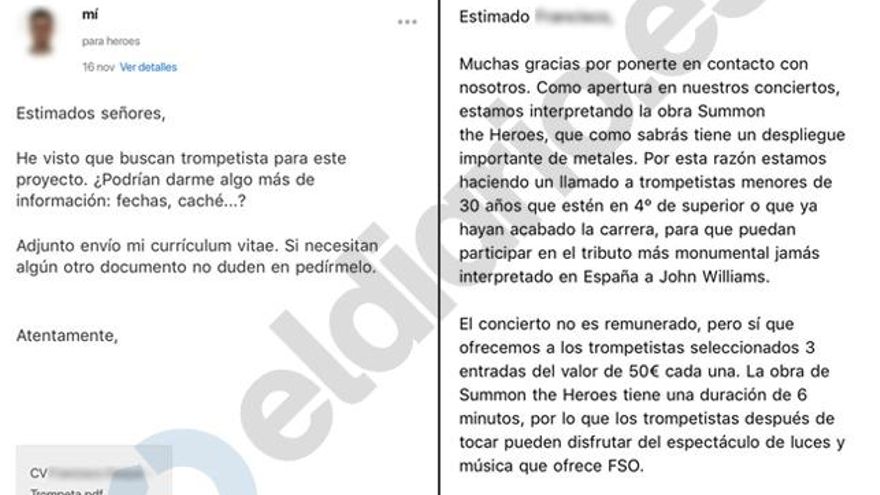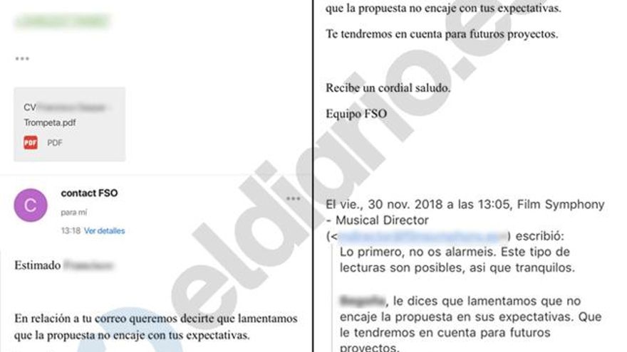 Pero la polémica no acabó con un correo. Después de que Tomás se mostrara en desacuerdo con la política de pagos en especie, la Film Symphony Orchestra le contestó: “Lamentamos que la propuesta no encaje con tus expectativas. Te tendremos en cuenta para futuros proyectos”. La sorpresa para el trompetista llega cuando baja hasta el final del email y en él encuentra un correo interno de la empresa reenviado por error.