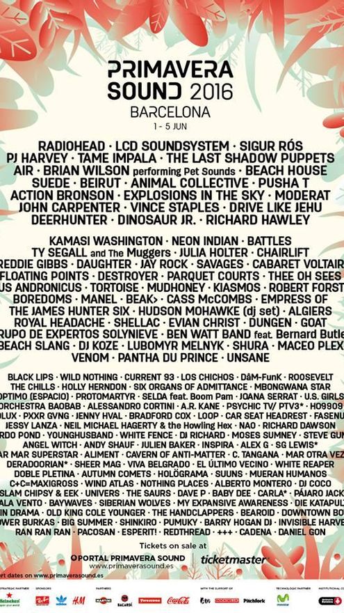 Es uno de los anuncios más esperados del panorama festivalero español. El Primavera Sound ha publicado en su página de Facebook los artistas y grupos que actuarán en su próxima edición, que se celebrará entre el 1 y el 5 de junio (como siempre, más concentrado en el fin de semana del 2 al 4). Radiohead, PJ Harvey, LCD Sound System, Brian Wilson, Tame Impala, Beirut, Suede, Animal Collective, Beach House, Dinosaur Jr, Julia Holter, John Carpenter o Sigur Rós, entre muchos otros.