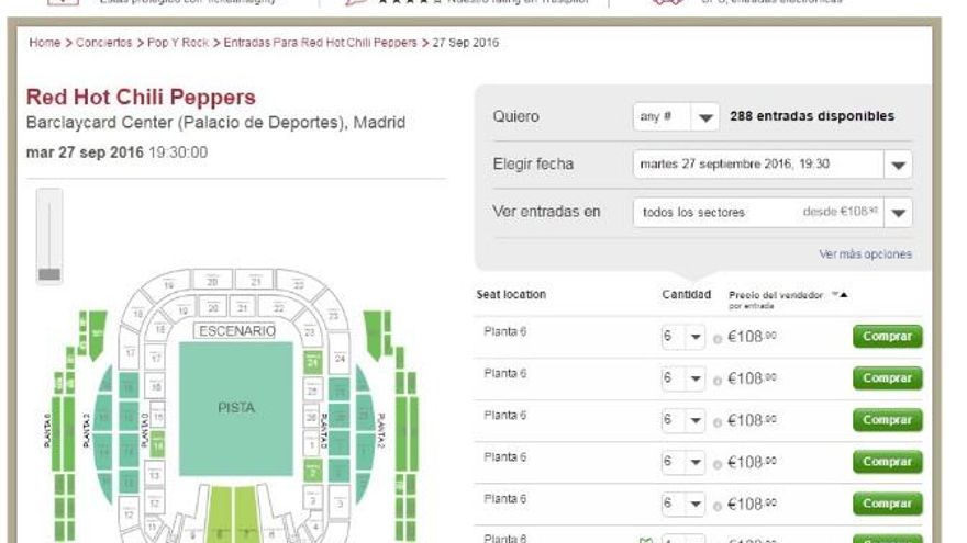 Apenas pasaban unos minutos después de las 10 cuando en Seatwave ya se podían encontrar entradas para el concierto que la banda californiana dará en nuestro país en otoño. Como suele ser habitual en estos casos, el precio doblada el original. Ningún ticket en la página “propiedad de Ticketmaster” baja de los 100 euros.