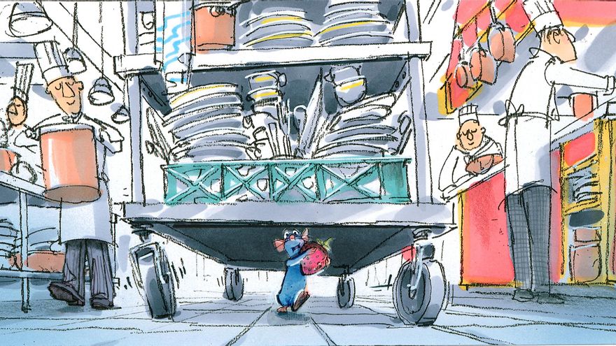 Lo primero, esa recreación milimétrica de París, después las escenas de agua, que fueron, dicen, más complicadas que muchas de Nemo, y el diseño de los platos que aparecen en la historia. Se crearon más de 200, pero antes los animadores asistieron a clases de cocina e investigaron y fotografiaron el proceso de descomposición de quince tipos distintos de alimentos. Una joya que el New York Times definió como “una pieza casi impecable de arte popular, así como una de las representaciones más persuasivas que un artista convirtió en película”.