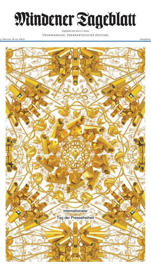 La obra que abre hoy muchos diarios -un entramado dorado de esposas, cámaras de vigilancia, pájaros de Twitter y puños mostrando una peineta- fue puesta a disposición de los rotativos por la Federación Alemana de Editores de Prensa (BDZV)