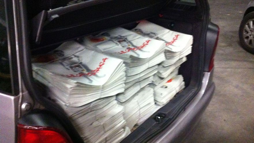 “Tengo ganas de que nos vaya mejor y podamos contratar a alguna empresa que se encargue de ensobrar”, señala Darío Adanti en uno de los descansos para comer pizza durante el ensobrado del nuevo número: “Sentarnos a su lado y corregirles cualquier pequeño detalle: 'Perdona, se te ha arrugado un poco el cierre'. Cosas así”.