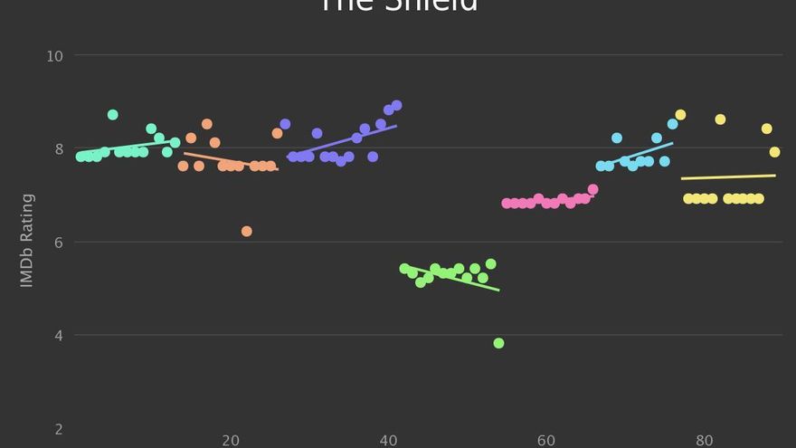 Hay una leyenda urbana que afirma que las buenas series son las que duran 5 temporadas, alimentada en parte por el hecho de que coinciden con las que tuvieron The Wire (5), Los Soprano (6) o A dos metros bajo tierra (5), y que otras como Dexter (8), Cómo conocía vuestra madre (9) o Expediente X (9) se desdibujaron en sus tramos finales. Si fuera cierto, nos hubiéramos quedado grandes temporadas de series como The Shield (7), El ala oeste (7), Frasier (11) o Urgencias (15). En este caso, la web Graph TV vuelve a ser muy últil para ver la evolución de muchas series y derribar unos cuantos mitos.