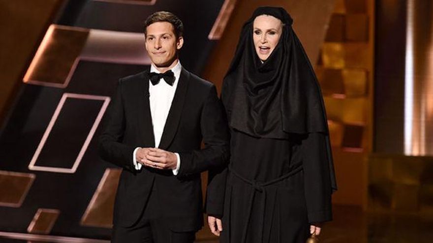 ‘Shame’, ‘Shame’, Shame’. En su monólogo inicial, Andy Samberg ya no ha estado tan inspirado: repaso a los nominados, bromas con el objetivo de arrancar muecas a cámara y guiños a la actualidad, desde Donald Trump, quizás uno de los nombres más mencionados de la noche, a los escándalos de Bill Cosby, convertidos en una recreación del 'paseo de la vergüenza' de Juego de Tronos.