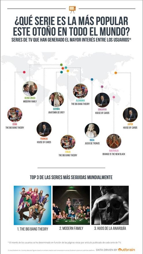 A nivel mundial, las series que lideran el ránking son The Big Bang Theory, Modern Family (Fox) e Hijos de la Anarquía (Fox), una serie que estas semanas está emitiendo su séptima y última temporada en Estados Unidos. Estas son las series más populares entre la audiencia, o por lo menos las que más despiertan el interés de los seriéfilos lectores. Las series que más generan artículos sobre ellas son The Walking Dead, Scandal (Fox) e Hijos de la Anarquía.