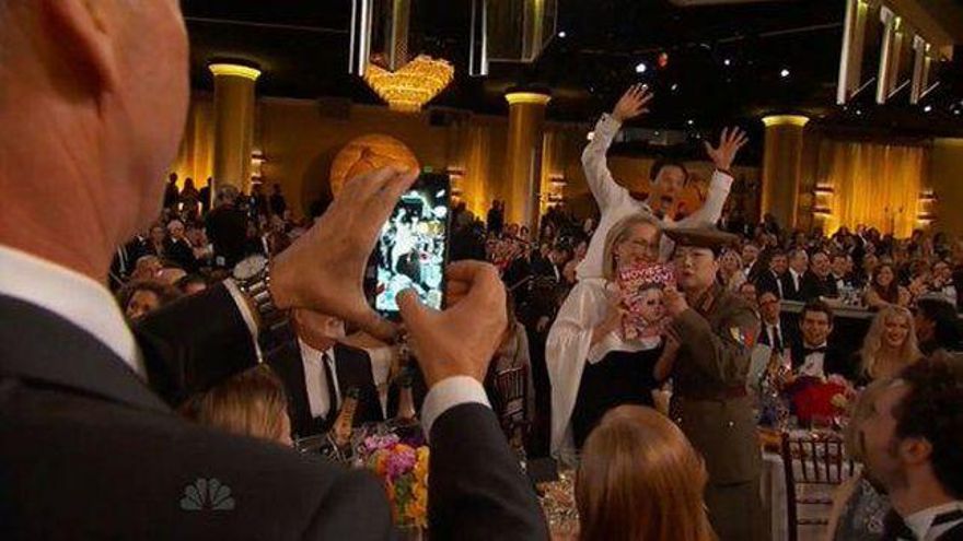 Benedict Cumberbatch, omnipresente. No se ha llevado el premio por The imitation game pero ha vuelto a demostrar porque últimamente es la salsa de todas las fiestas. Sentó cátedra en los photoboms con el que hizo a U2 en los Oscar de 2014 y esta noche lo ha vuelto a repetir con permiso de Meryl Streep.