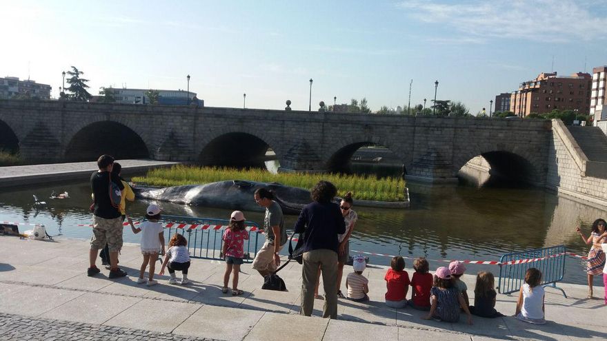 A las 10:30 de la mañana se ha resuelto el misterio. El cachalote del Manzanares es Whale, una escultura hiperrealista realizada por el colectivo belga Captain Boomer, que simula cómo se activa un caso real de emergencias ante una ballena varada. El proyecto artístico ya se había desarrollado en ciudades como Londres, Amberes o París.